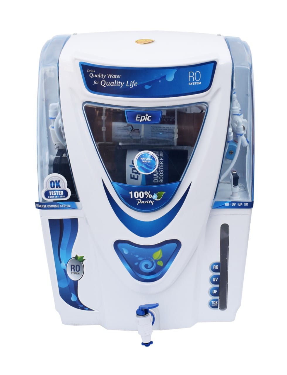 designed to provide clean and safe drinking water by removing impurities, bacteria, and dissolved solids. The purifier in the image is branded Epic